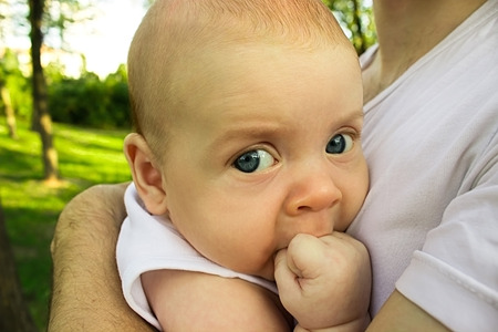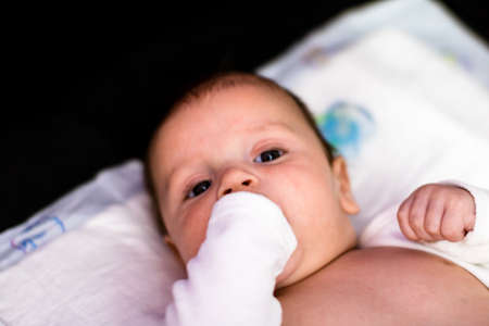 Little baby boy with big blue eyes sucking his little fist in mouth. Lying on fathers arm