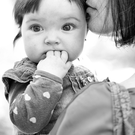 Loving mother holding her baby daughter in her arms looking at her tenderly in a close up family portrait