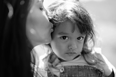 Mother and daughter loving kiss. Mother embrace child girl. Tender kiss on the kids cheek. Close up face of mother and daughter. Portrait of a mom kiss her child. Mom kiss daughter. Loving mother.