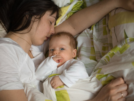 Close-up of baby boy sleeping while breastfeeding. Newborn child, motherhood concept