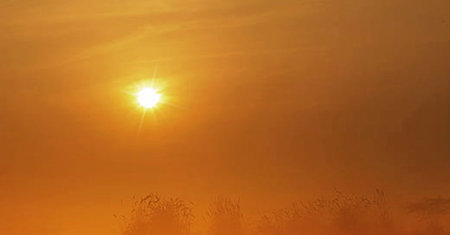 Glowing sun setting over a sea of clouds in a warm golden sky