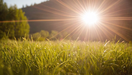 Summer landscape of green nature on morning meadow with shining grass and bright sunbeams through branches of tree. Vivid sunlight in amazing park