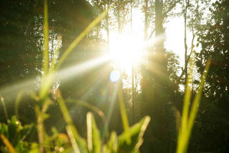 Beautiful early morning sunburst through the leaves in the forest