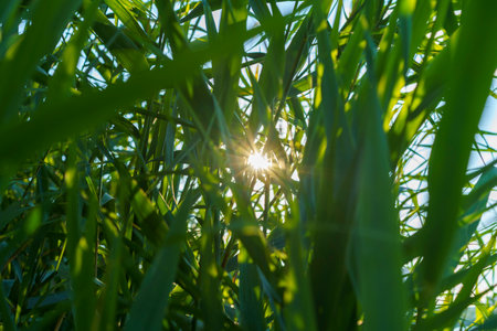 Sun rays shining through the plant leaves in the Regents park in London