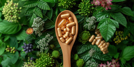 Natural herbal supplements scattered amongst fresh green leaves on a rustic wooden background.