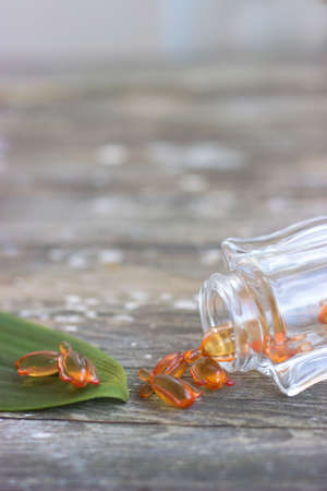 Serum capsules, blurred background, glass jar with the capsules and green palm leaf.