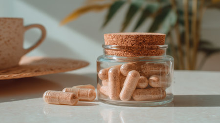 A clear glass jar holds herbal capsules with a cork lid, showcasing a serene home atmosphere filled with natural light. The wellness theme is emphasized.
