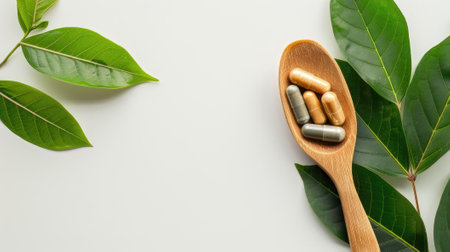 A wooden spoon holds a variety of vitamin tablets on a white background, accented by a green leaf. Embrace holistic health with natural supplements for a vibrant lifestyle