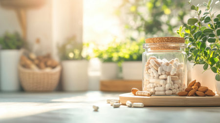 A serene and inviting indoor setting featuring a glass jar filled with capsules and almonds, surrounded by lush greenery, promoting a lifestyle of health and wellness.