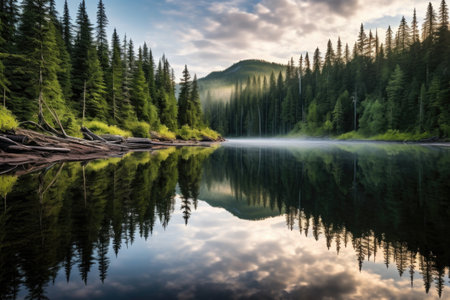 Discover the tranquil beauty of a serene forest lake, surrounded by towering evergreen trees and enveloped in mysterious fog. This peaceful scene invites reflection and relaxation in a captivating natural environment rich in greenery and calm waters.