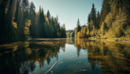 Tranquil scene of autumn forest reflects natural beauty in water generated by artificial intelligence