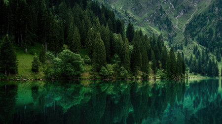 This serene image captures a quiet forest scene with a still lake reflecting the surrounding trees and misty mountains, evoking a sense of tranquility and peace.