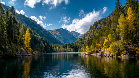 A tranquil alpine lake reflects vibrant fall foliage, encircled by dense green woods beneath a clear azure sky, evoking peaceful autumn serenity.