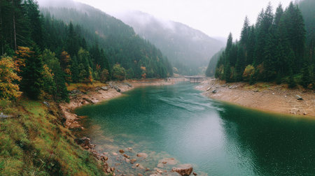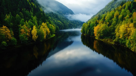 Tranquil mountain lake scene enveloped in mist showcases vibrant autumn foliage. A perfect escape into nature's harmony and a serene atmosphere for relaxation.