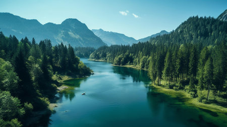 This captivating image is an excellent fit for travel brochures, environmental campaigns, or nature-related editorial content | The photograph presents a tranquil mountain lake cradled by verdant forests and imposing peaks, evoking a sense of serenity and untouched wilderness. The water mirrors a breathtaking range of blues, from the deepest navy to the softest turquoise, reflecting the clear sky above. The dense forests surrounding the lake display various shades of green, highlighting the rich diversity of flora. A single small boat with a person rowing in the center of the image emphasizes the scale and grandeur of nature, while invoking thoughts of adventure and exploration. The mountains in the background stand as silent sentinels, their rocky faces partly shrouded by the haze of distance, adding depth and a sense of mystique to the landscape. Natural light filters through the scene, casting gentle shadows and enhancing the contrasting textures of water and foliage. The lake's undisturbed surface, aside from the subtle wake of the boat, suggests tranquility and a moment frozen in time | The image can be utilized in ecological studies as a representation of natural ecosystems, as inspiration in travel and adventure blogs, or as a calming visual piece in wellness and meditation spaces. It's also well-suited for use in articles discussing the importance of protecting natural environments or for promoting outdoor activities such as hiking, camping, and boating | a picturesque scene of a mountain lake with surrounding forests and a rowboat under clear skies, capturing nature's majesty with rich colors and an atmosphere of peacefulness, providing an expansive canvas for text or graphic elements