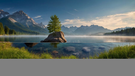 Capture the essence of a tranquil morning scene with mist drifting over a calm lake, surrounded by majestic evergreen trees and mountains.