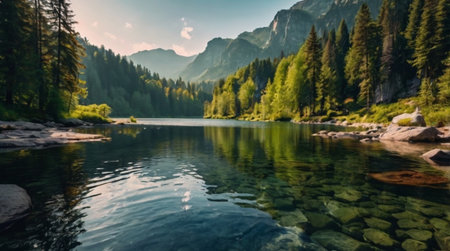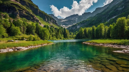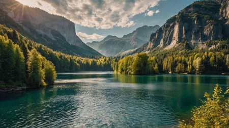 Nestled within towering mountains, this crystal-clear lake mirrors the surrounding nature, creating a breathtaking vista that highlights the beauty of tranquil waters and lush greenery.