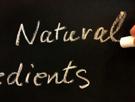 Woman finger hold white chalk and writing natural word on blackboard for explain product description made from natural.