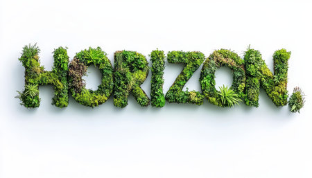 Word HORIZON made from lush green moss, succulents, and air plants on a clean white background.