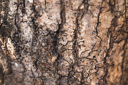 Closeup macro detail of old aged beautiful oak maple tree bark barque. Natural wooden textured abstract tree background unusual pattern shape with cracks, checks, holes and curvy lines.