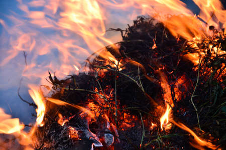 Open flame. Burning dry grass in the field. Extreme disaster and forest fires during a drought. Destruction of agricultural land.