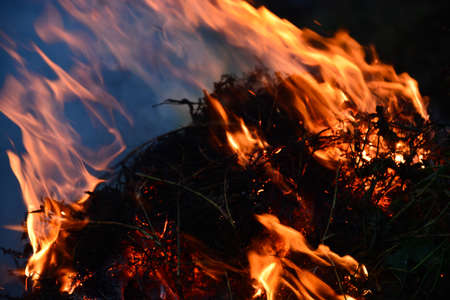 Bonfire. Orange flame of a fire. Bonfire on the grill with smoke. Arson or natural disaster. Bonfire close. Fire in nature. Bonfire background.