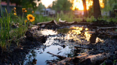 The setting sun casts a golden glow over a muddy path, highlighting puddles and debris in a scene of quiet, rustic beauty.