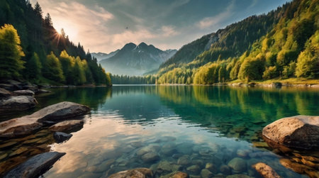 Peaceful mountain lake at sunset. Golden light reflects on calm water.