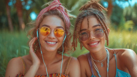 Happy Young Women with Dreadlocks Having Fun Together in the Forest Clearing, Laughing and Enjoying Natures Beauty