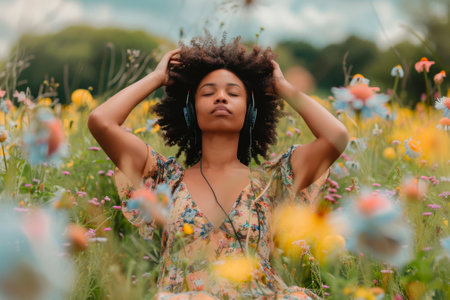 young african american woman with afro hairstyle and headphones listening to music in field of flowers