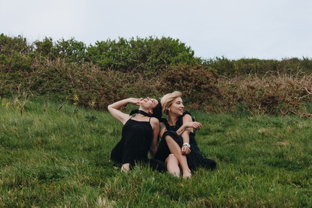 happy young women in black relaxing on green meadow