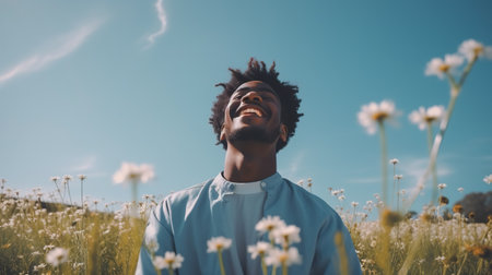 Calm Happy Smiling Black Man with Closed Eyes on the Fields. Free, Peace, Beautiful Moment Concept
