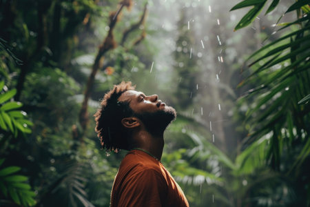 A man stands in a lush, tropical forest, his eyes closed as he takes in the gentle rain. He appears and relaxed peaceful, as if he is enjoying the moment.