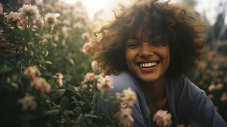 Radiant woman with curly hair laughs heartily amidst vibrant garden blooms