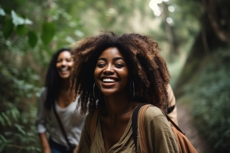 happy, friends and smile with a black woman in nature for freedom, adventure and fun on the road, created with generative ai