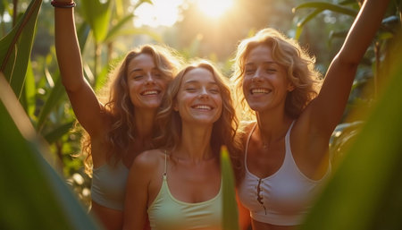 Friends celebrate summer getaway in lush tropical setting with laughter and smiles amidst vibrant greenery. Tropics are climatic zones of Earth in which Sun is at its zenith at least once year. AI