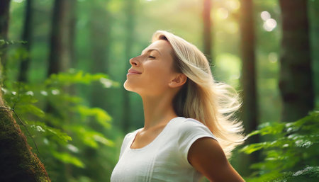 A calming image of a woman standing in a verdant forest, breathing deeply to embrace the fresh air. The scene exudes relaxation, tranquility, and harmony with nature, inspiring mindfulness and