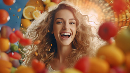 The woman lies in vegetables and fruit, the woman with apple
