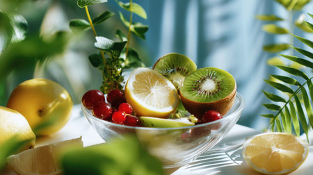 A beautiful arrangement of fresh fruits in a glass bowl, including lemons, kiwis, and cherries, surrounded by lush green leaves and soft natural light. Perfect for promoting health and wellness.