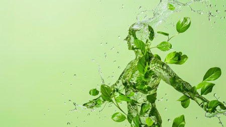 Nature symphony: human silhouette formed by water and leaves on green background