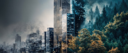 Modern city merging with nature in surreal environmental banner.