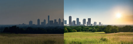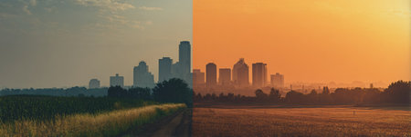 A view showcasing the stark difference between a city skyline and a serene rural landscape, captured during golden hour with warm tones.