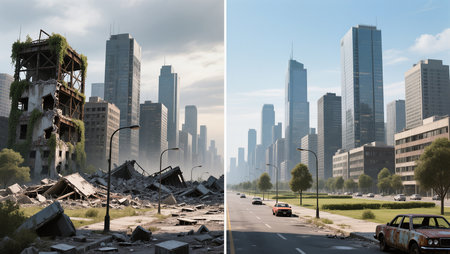 Surreal contrast shows a city's evolution from decay to vibrant life.