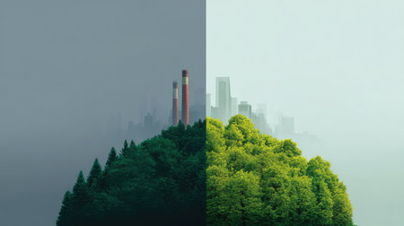 This image powerfully divides urban pollution from lush nature, highlighting the stark contrast between industrial growth and the serenity of unspoiled landscapes, urging reflection on conservation.