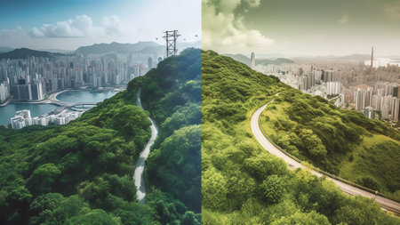 Contrasting cityscape and landscape divide, urban-nature harmony. generated by ai
