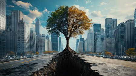 A large tree, half green, half yellow, grows from a crack in a city road. Its roots break the asphalt, symbolizing the balance of nature and urban development.