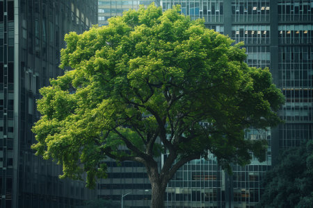 A captivating view of urban life highlighting fresh greenery juxtaposed with sleek glass buildings, creating a peaceful and harmonious cityscape.