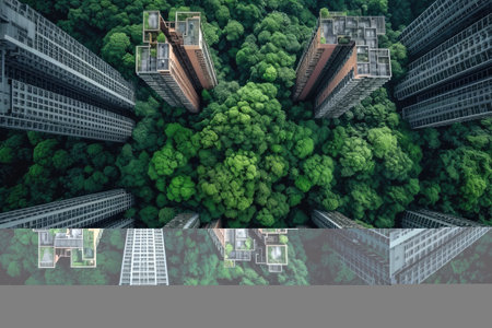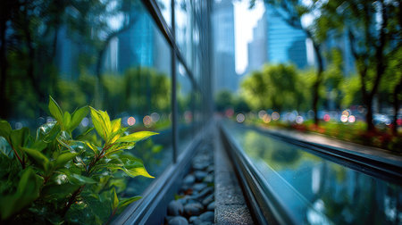 This captivating urban landscape showcases the blend of modern architecture and lush greenery, featuring glass buildings reflecting nature. The scene highlights the harmony between urban life and the environment, demonstrating the importance of integrating green spaces in city design.