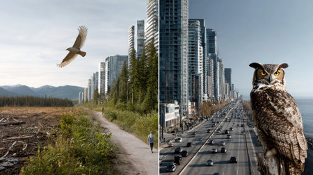This captivating image juxtaposes a serene path through a forest with soaring birds and the hustle of city life featuring an owl in the foreground.