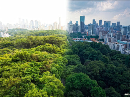 Aerial view of a city skyline dividing a lush green forest and a polluted dark forest.